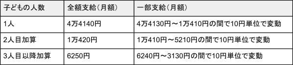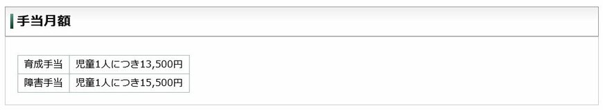 手当月額は、子ども1人につき1万3500円で、障害がある場合は1人につき1万5500円です。
