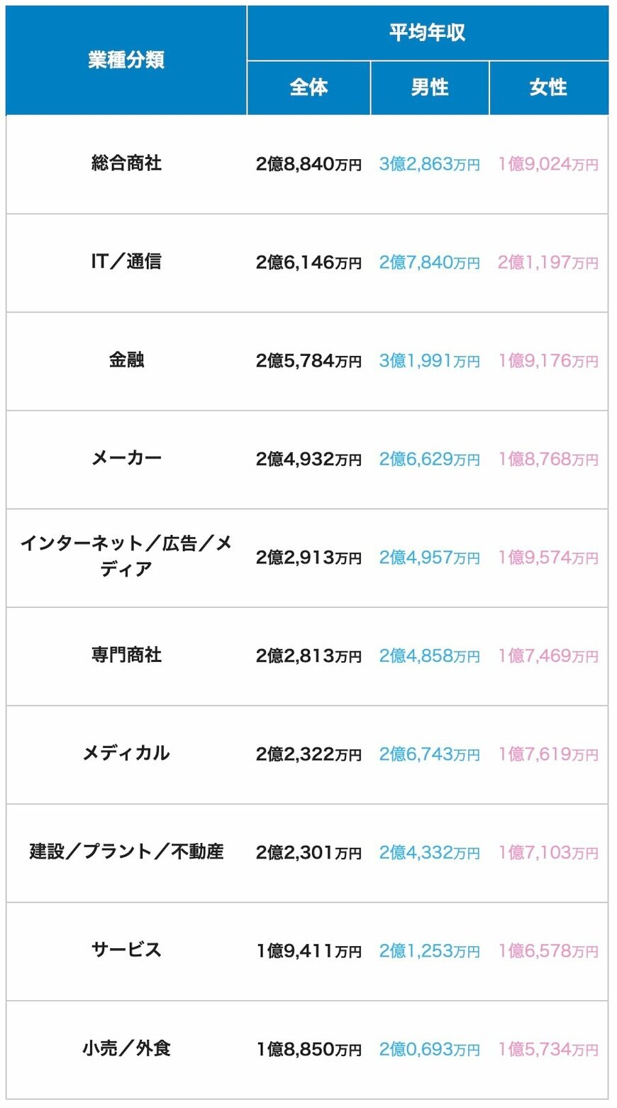 dodaの「平均年収ランキング(生涯年収・生涯賃金)【最新版】」における、業種別の生涯年収ランキングは下記の通りです。