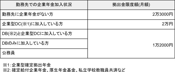 会社員や公務員などの拠出金は、勤務先の企業年金の導入・加入状況により以下のように毎月の限度額が異なります。