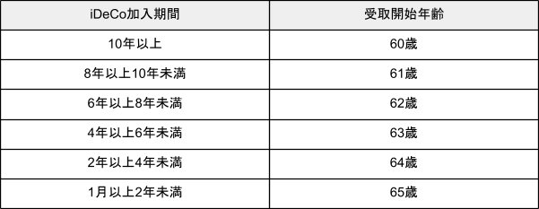 ただし、60歳から受取開始するためには10年以上iDeCoに加入していることが条件となっており、10年未満の場合は受取開始年齢が下記のように引き下げられます。
