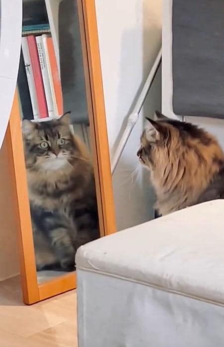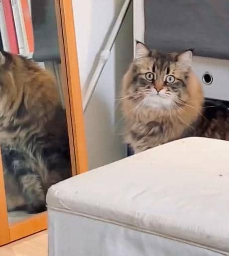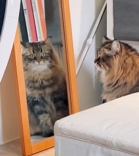 猫ちゃんが鏡の前でとった行動が賢いとX(旧Twitter)で注目を集めています。