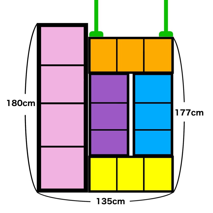 @natsu_eringiさんによると、今回倒れた棚は3段と4段のカラーボックスを組み合わせて大きい1つの棚にしていて、縦180cm、横135cm程のものとのこと。