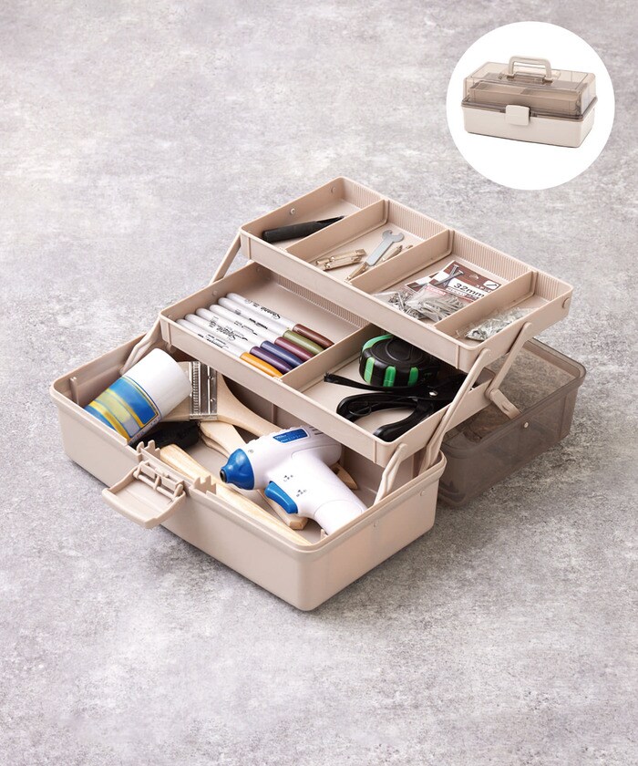 ネイルキットやハンドメイド用具など、細かいものを収納するのにぴったりなツールボックスです。可動式の仕切りが付いているので、お好きな場所で区切って収納できます。フタが半透明なので、何が入っているか分かりやすいのもうれしいポイント。落ち着いた色合いでお部屋に馴染みやすいアイテムです。