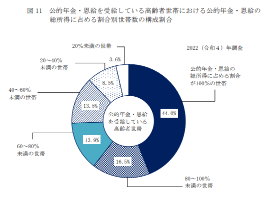 厚生労働省「2022(令和4)年 国民生活基礎調査の概況」によれば、年金を受給する高齢者世帯で「公的年金・恩給の総所得に占める割合が100%の世帯」は44.0%でした。