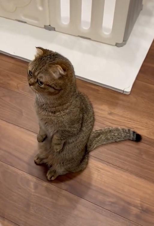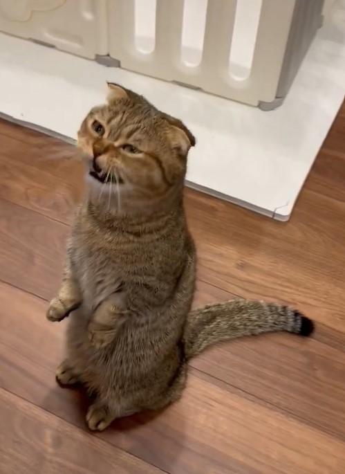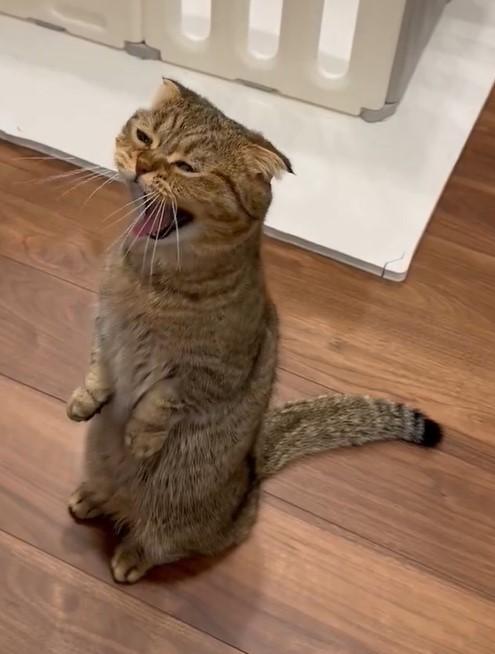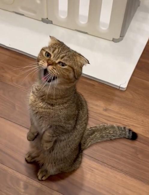 動画に写っているのは、ベビーサークルの前で立っちするたぬ吉くん。飼い主さんが「あくびして」と声を掛けました。