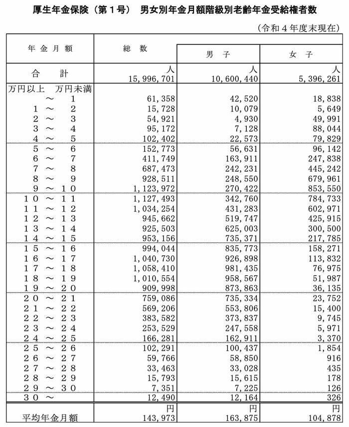 厚生労働省年金局の「令和4年度 厚生年金保険・国民年金事業の概況」によると、令和4年度の厚生年金の平均受給額は「14万3973円」となっています。(※厚生年金の年金額には国民年金が含まれます)