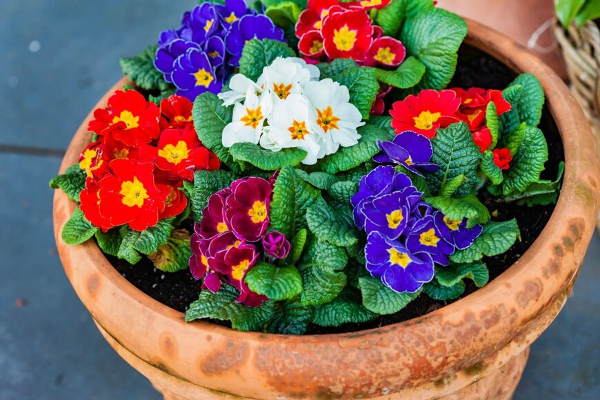 ビビッドな原色が冬空に映えるプリムラ・ジュリアン。低い位置でコンパクトにまとまるので、寄せ植えにもよく利用されています。