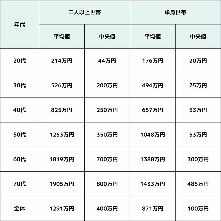全体の平均値としては、二人以上世帯が1291万円、単身世帯が871万円です。より実態に近いとされる中央値は、二人以上世帯が400万円、単身世帯が100万円となっています。