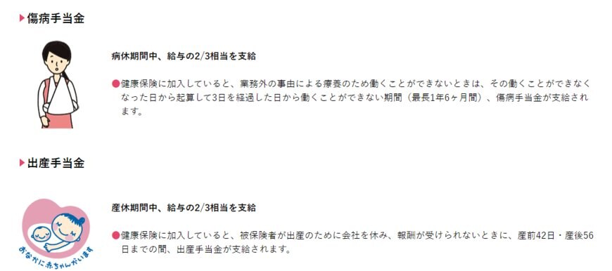 出産手当金や傷病手当金の給付対象となるのも、その一例です。保障がない状況に比べて、いざというときの出費に備えられるでしょう。