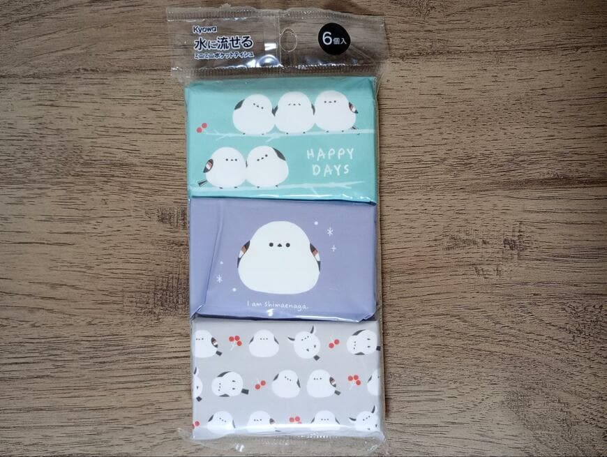 セリアでは、シマエナガデザインのポケットティッシュも販売されています。水に流せるポケットティッシュが6つセットになって110円(税込)です。