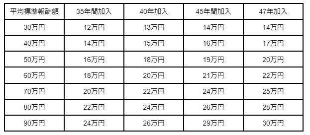 年金額のシミュレーションより、年金額が30万円になるのは、平均標準報酬額90万円で厚生年金に47年間加入したケースです。