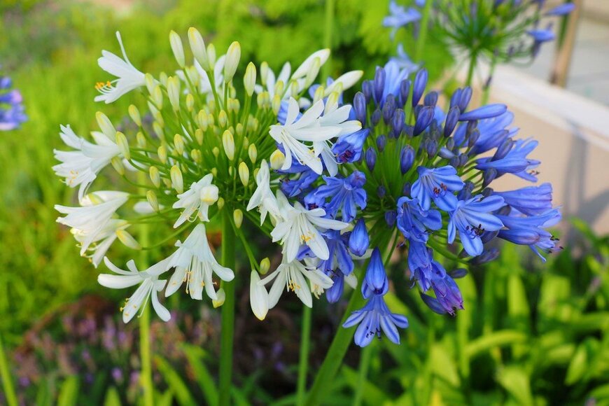 まるで打ち上げた花火のように、放射線状に花を咲かせるアガパンサス。パープルやホワイトの花色が爽やかで、ナチュラルガーデンにもおススメです。