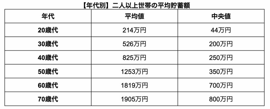 1. 【20歳代~70歳代】各年代の平均貯蓄額(平均値・中央値)を確認