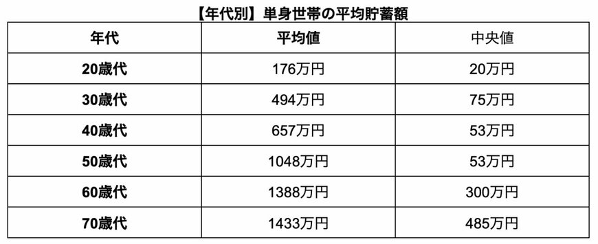 3. 【単身世帯】20歳代~70歳代の貯蓄額の平均と中央値