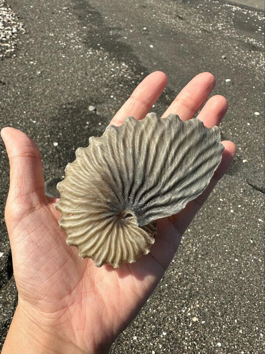 「ビーチコしてたら通りすがりのおじさんに『これ何貝かわかる?』って聞かれて『ああぁぁあ!!これはタコブネっていって中にタコが住んでて〜!』と大興奮で話してたら『やるよ!』って言って去っていった…惚れてまうやろ〜!」というコメントとともに投稿されたのは、1枚の写真でした。