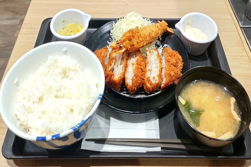 「ロースミルフィーユかつ&有頭大海老フライ(1尾)定食」をライス特盛で注文。ロースミルフィーユかつは調理に時間を要するとのことでしたが、約7分ほどで到着しました。