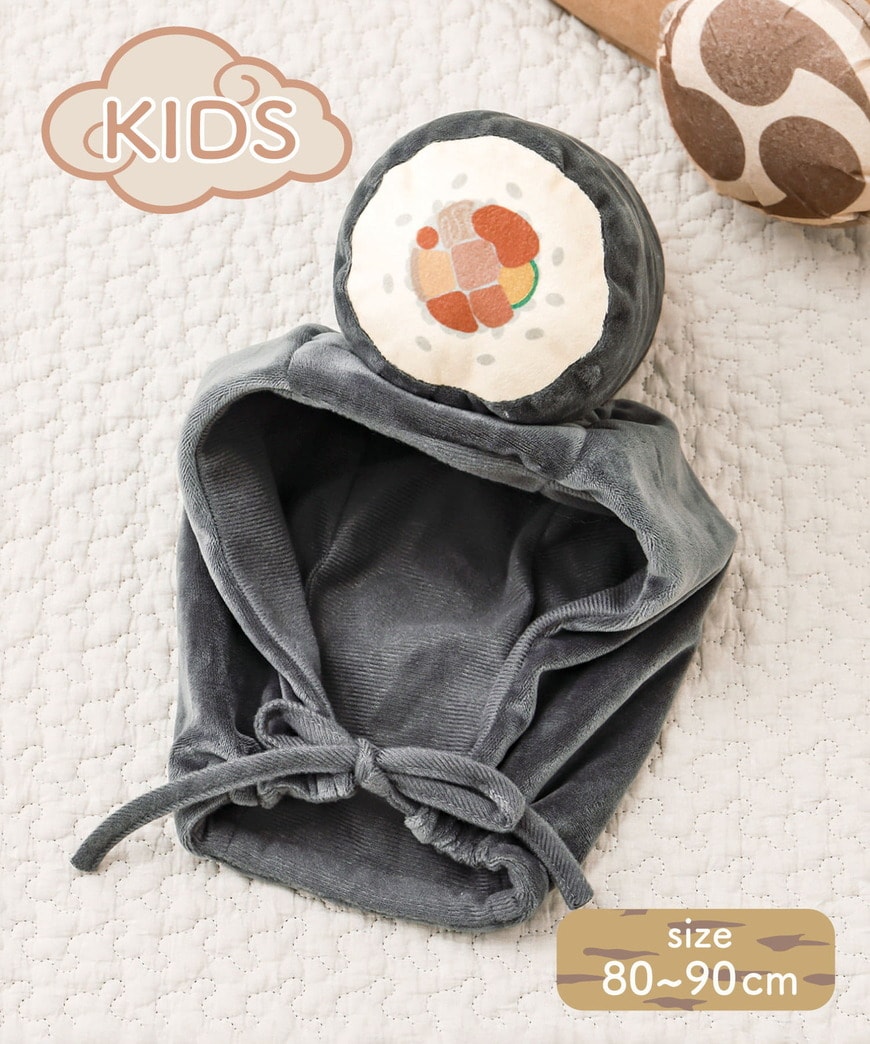 首元を結ぶタイプなので、かぶっていても窮屈さを感じにくいのがポイント。かぶらないときは恵方巻き部分にくるくると巻きつけ、ぬいぐるみとして扱うこともできます。