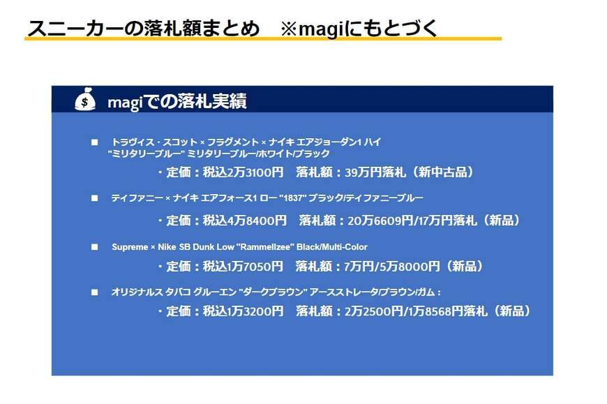 スニーカー買取に強いフリマサイト「magi」では、定価20倍程度での売買実績もあります。