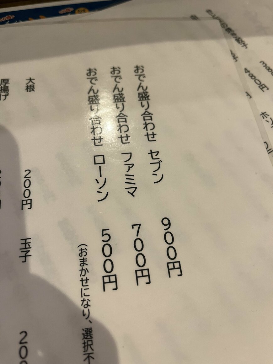 そこに写っているのは「おでん盛り合わせ セブン 900円 ファミマ 700円 ローソン500円」と記載されたメニュー。「居酒屋でコンビニのおでんを売っているの?」と思ってしまう人も多いのではないでしょうか。