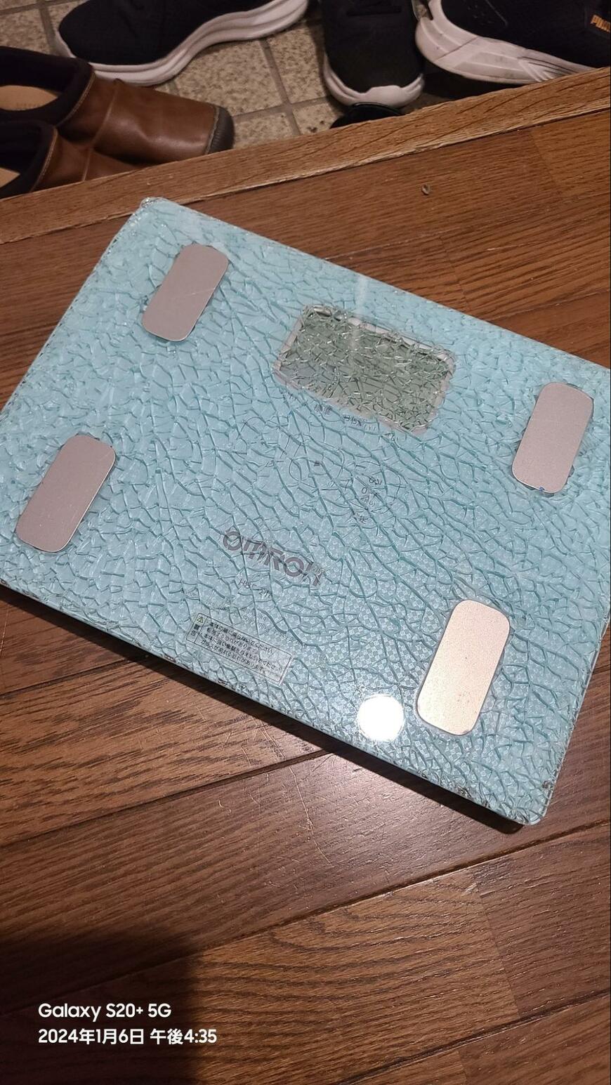 そこに写っているのは、オムロン製の体重体組成計。よく見ると、体重計のガラスは割れています…。