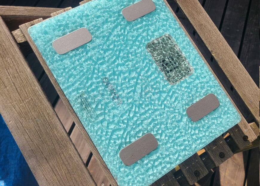割れた体重計が太陽光に照らされると、いっそう「きれいな模様」のように見えます。もしも身の回りのガラス製品が「芸術的な割れ方」をした際は、くれぐれも踏まないように注意したいですね。