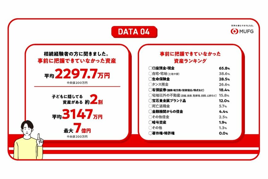 事前に把握できなかった資産ランキングでは、意外にも「貯金・生命保険・有価証券・不動産」など。 わかりやすそうな財産も把握できていないことが多いようです。