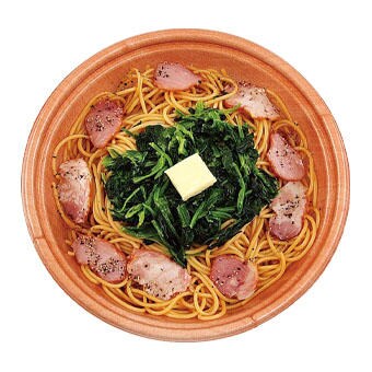 「かつおだしを効かせた醤油だれに、バターとニンニクの風味を効かせて炒めた和風パスタです。麺とほうれん草をたっぷり入れボリューム満点に仕上げました。」