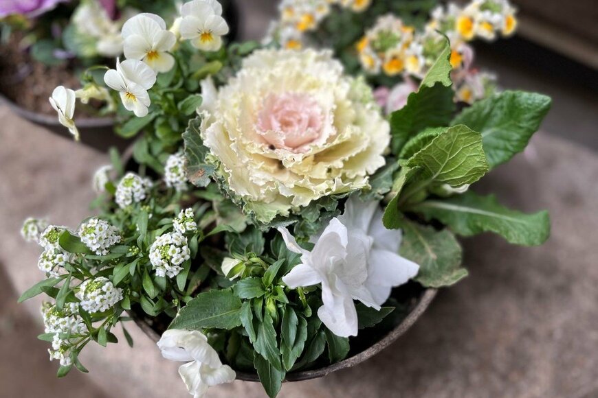 今回は、玄関先に飾る「真冬の寄せ植え」におすすめの草花について紹介しました。