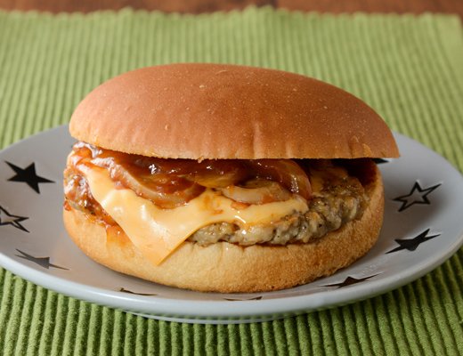 「玉ねぎやマッシュルームと楽しめるデミグラスソースで仕立てたチーズバーガー。」