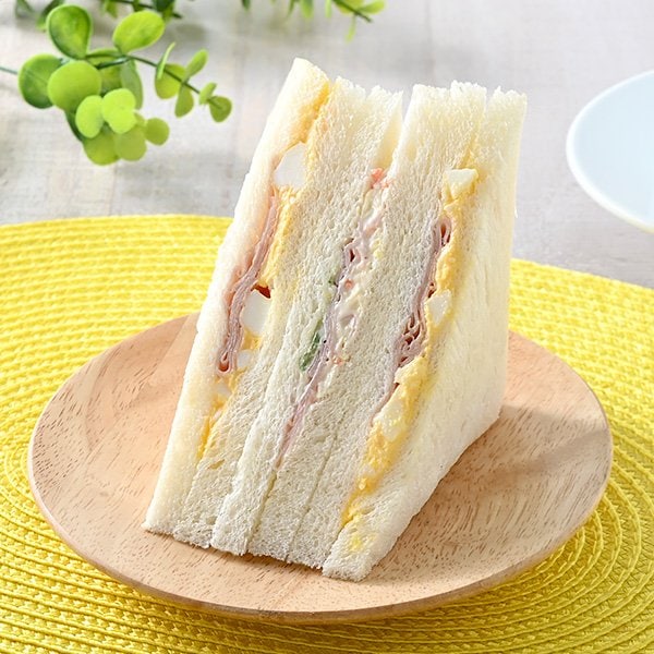 「たまご本来の味わいのたまごサラダとポークハムを挟んだサンドイッチと、ポークハムとハムサラダにきゅうりのマヨソース和えを挟んだサンドイッチの組み合わせです。」
