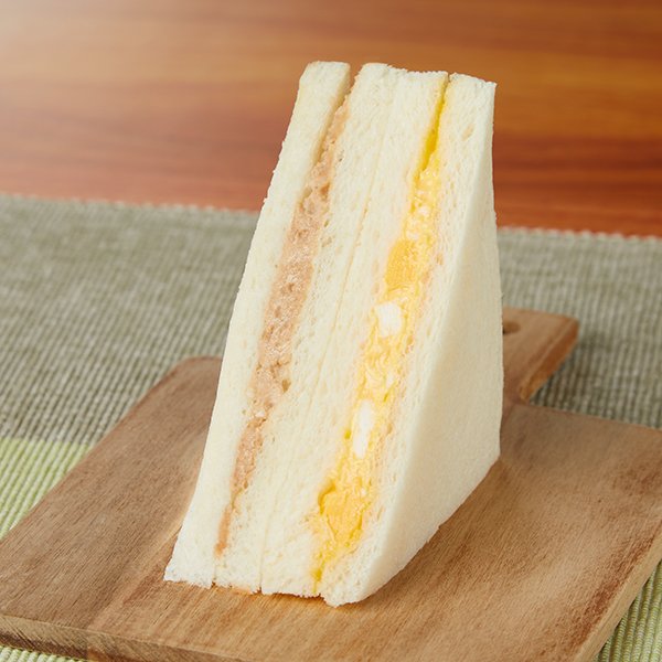 「人気の2つの具材の組み合わせです。玉ねぎみじんとあらびきペッパーを加えたツナサラダと、玉子本来の味わいの玉子サラダのサンドイッチです。」
