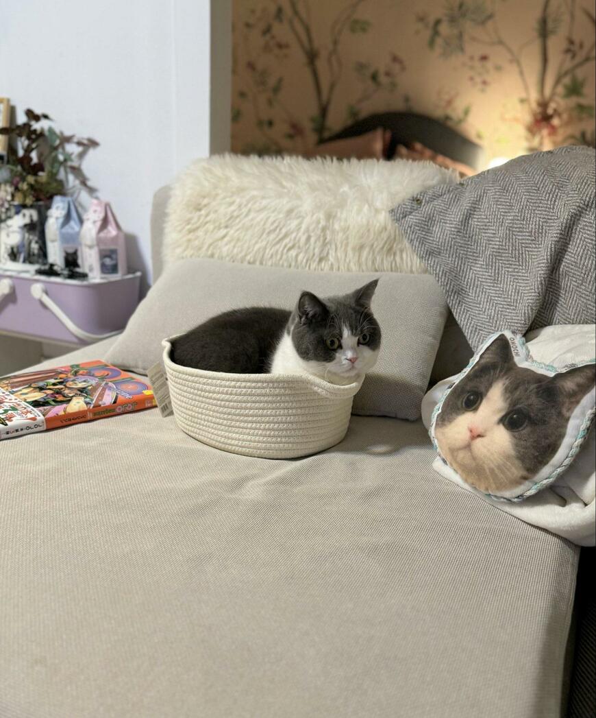 Xでたくさんの注目を浴びているのは、猫の女の子「おもち」ちゃん。飼い主さんはクリーム色のカゴを使おうと、お部屋に設置したようですが……?そこには、おもちちゃんが「スッポリ」とおさまっていました。