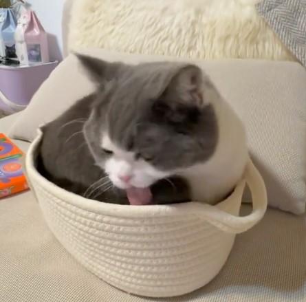 カゴにおさまりきる前に、ペロリと毛づくろいをするおもちちゃん。落ち着いた仕草や表情からは、この場所を気に入っていることが伝わってきます……!