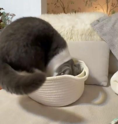 「あれ?使おうと思って持ってきたカゴにジャストフィットしてる」というコメントとともに投稿されたのは、一匹の猫ちゃんが写る写真と動画でした。