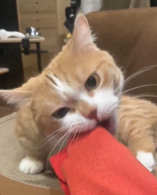 飼い主さんが身にまとっている服の「袖」を発見した虎太郎くん。ジーッと観察してから「ガブリ」と噛みつきます。夢中になってカミカミとじゃれており、無邪気な姿がとっても愛らしいです。