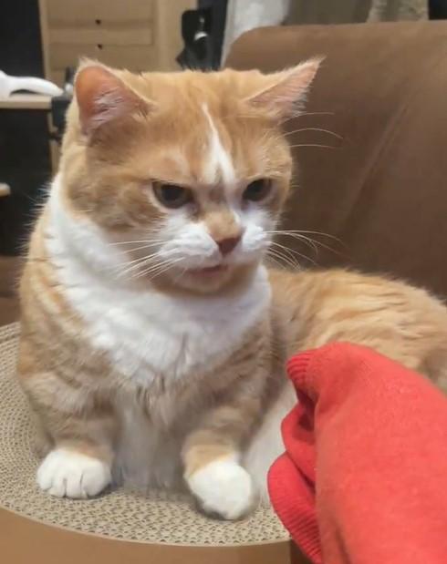 そして口を半開きにして、顔を「スーッ」と離します。表情は険しく、なんだか怪訝そうにも見えてきます……。先ほどまで威勢よくじゃれていたのに、突然のフレーメン反応を見せた虎太郎くん。