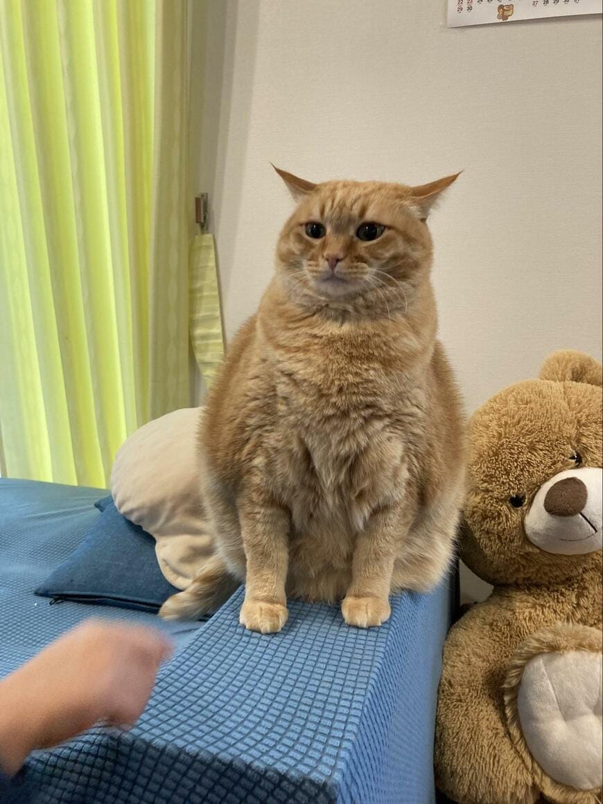 Xで多くの注目を浴びているのは、茶トラ猫のすずくんです。写真には、もふっとお座りしながら、静かに驚いたような表情を見せるすずくんが写っていました。