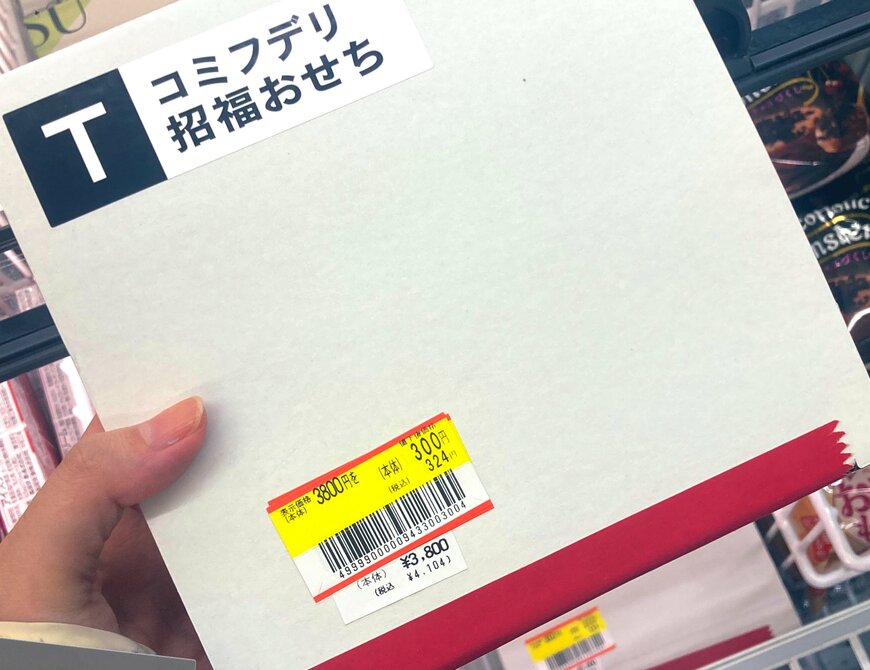 そこに写っているのは「コミフデリ 招福おせち」と記載されたパッケージ。表示価格(本体)3800円を300円に値引きするシールも貼られていて、思わず手に取ってしまいそうになりますね。