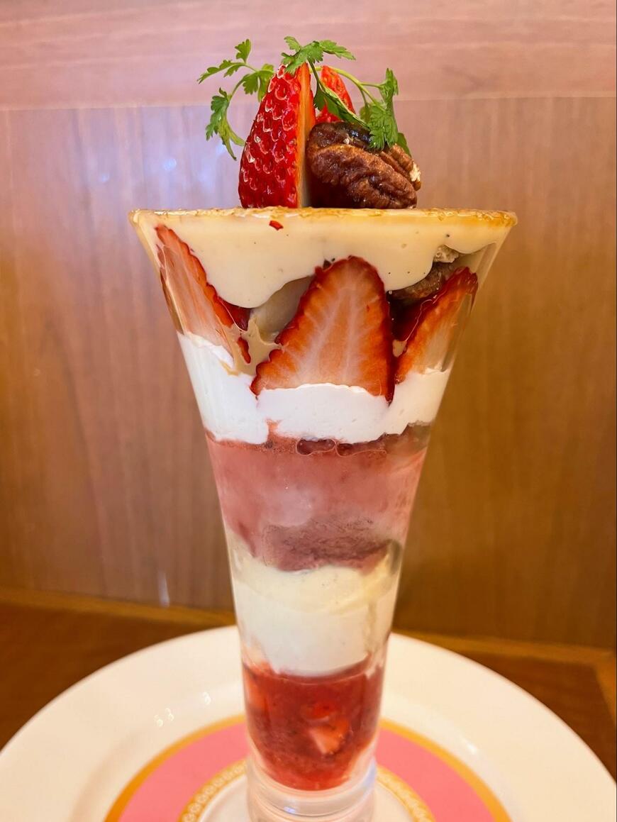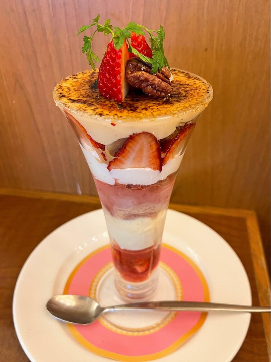 トップには彩りのセルフィーユと国産苺とピーカンナッツが可愛らしく飾られています。クレームブリュレ、フレッシュな苺、そしてひんやりした各種アイスクリームやソルベの層のコントラストがとても魅力的ですね。