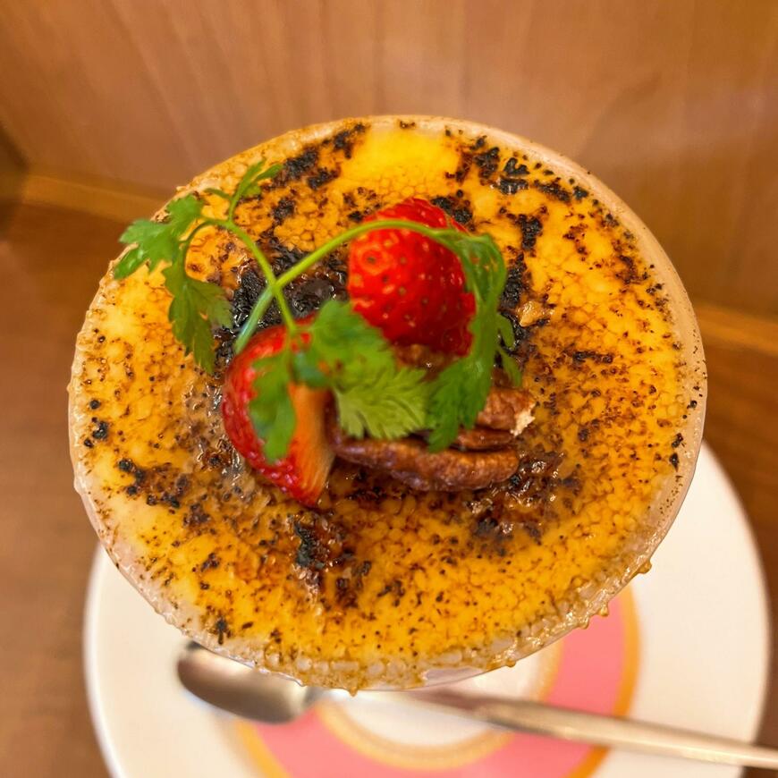 デザートの注文は、グランドメニューと同じ扱いで10:30から可能になります。注文からあまり待たずに、クレームブリュレの焼き目にそそられる、鮮やかなパフェが運ばれてきました。