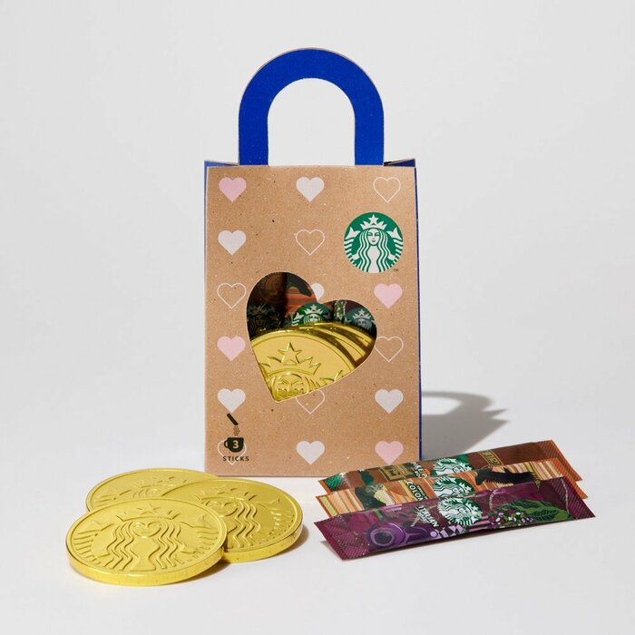スターバックス ヴィア®とロゴチョコレートがセットになったカジュアルギフトです。スターバックス ヴィア® パイクプレイス®(ロースト・コロンビア・イタリアン ロースト)各1本(計3本)と、ロゴチョコレート3枚が、ショッパーデザインのパッケージに入っています。バレンタインシーズンのカジュアルギフトにピッタリですね。