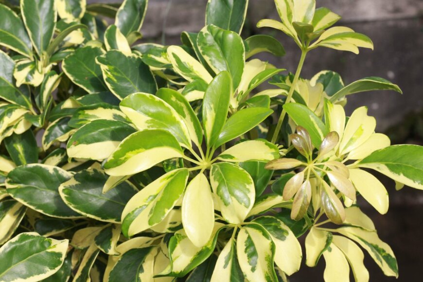 丸い大きな葉が花のように華やかに開くシェフレラ。「カポック」という名前でもよく知られ、初心者でも簡単に育てられる観葉植物として人気です。