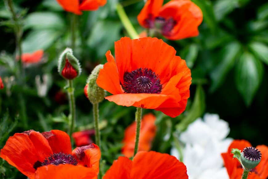 ヒラヒラとした大きな花弁が特徴のオリエンタルポピー。近年は、まるで絵画のような色彩の花色も登場しており、見応えのある花が楽しめます。