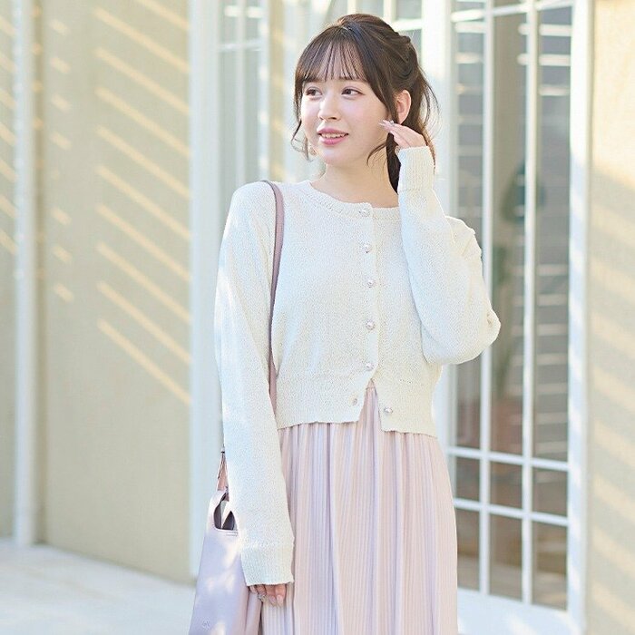 大きめサイズのパールボタンが付いた華やかなニットカーディガンです。ボタンを閉めてプルオーバーとしても着用でき、着回し力も抜群です。ショート丈で、ほかの洋服と組み合わせやすいのもポイントです。