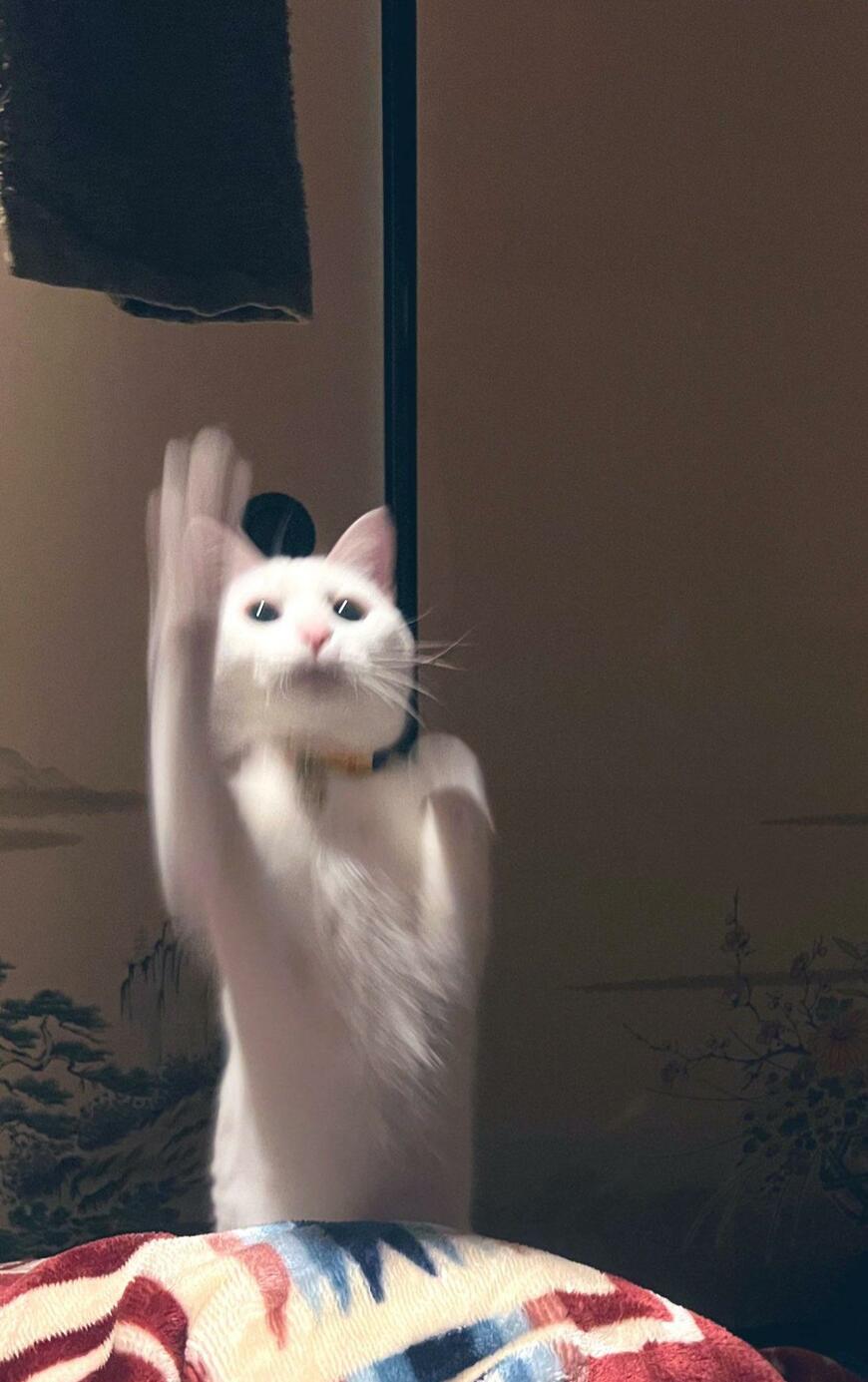 加湿用の濡れタオルを叩き落したい猫ちゃん。スカッと空振りし、難しい表情を浮かべる様子がX(旧Twitter)で注目を集めています。