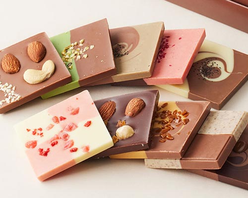 日本人の口に合うよう、ショコラの香りや苦み、口どけを追求したショコラに、ナッツなどをトッピング。ショコラとこだわりの素材が出会って生まれた、特別な板チョコレートです。