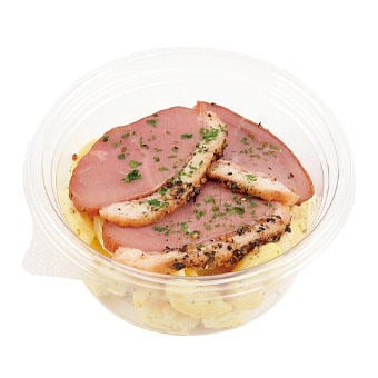 「2種類のマスタードを使用した、おつまみ仕立てのポテマカサラダです。マスタード風味のマカロニ入りポテトサラダに、リンゴチップでスモークした紅茶鴨パストラミをトッピングしました。」