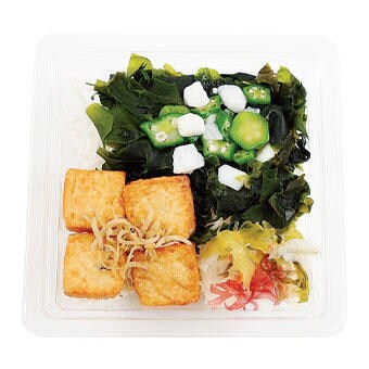 「食物繊維が多い食材を使用してカロリーを抑え、腹持ちもよいサラダです。大根をベースにオクラや山芋、わかめなどの海藻、厚揚げ、じゃこをトッピングしました。」