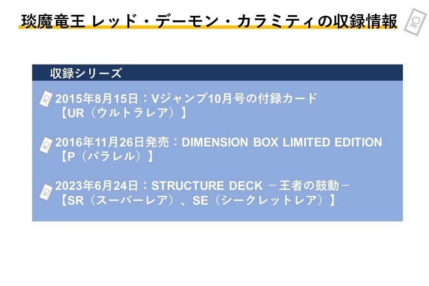 禁止宣言された琰魔竜王レッド・デーモン・カラミティが収録されたのは、2024年1月までに3回。レアリティは4種類です。