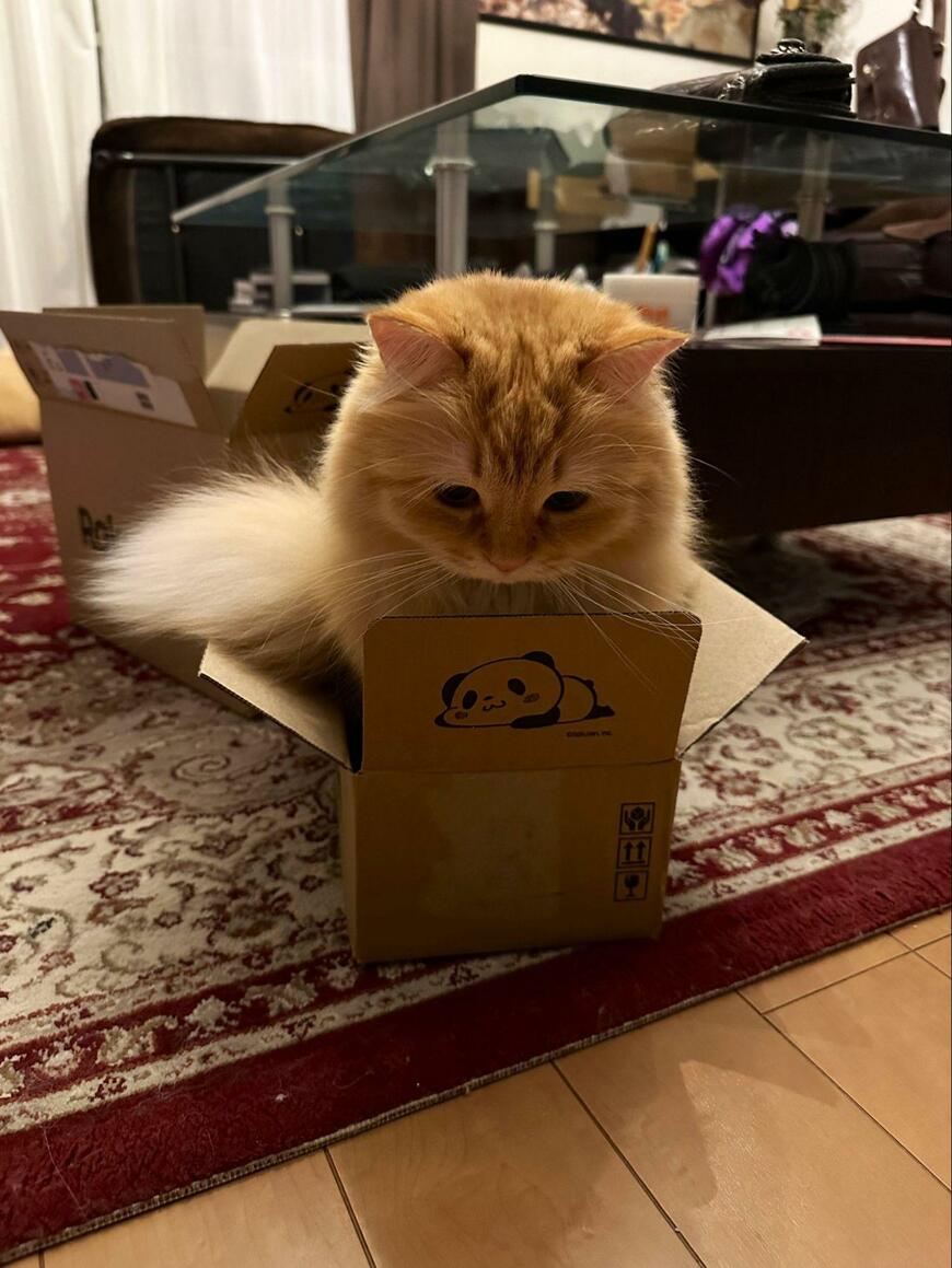 エマちゃんは隠れているつもりのようですが、段ボールが小さすぎてもふもふのお顔が丸見えです!さらにはうつむいて一点を見つめており、その表情はどこかションボリとした様子。